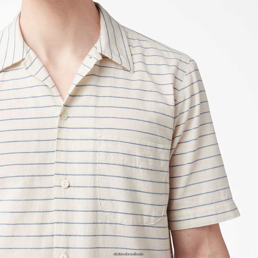 dos botões de concha até a abertura de lápis no bolso, a camisa de manga curta Dickies 1922 é trabalhada e executada com uma delicadeza que vai até os mínimos detalhes. projetada com um visual clássico que deve ser um pouco menos tradicional e mais vintage, esta camisa de acampamento é feita nos EUA com os melhores materiais importados. a ourela do tecido japonês é usada dentro da bainha do bolso de aplicação. esta camisa listrada tecida tem costas plissadas que dão mais mobilidade.