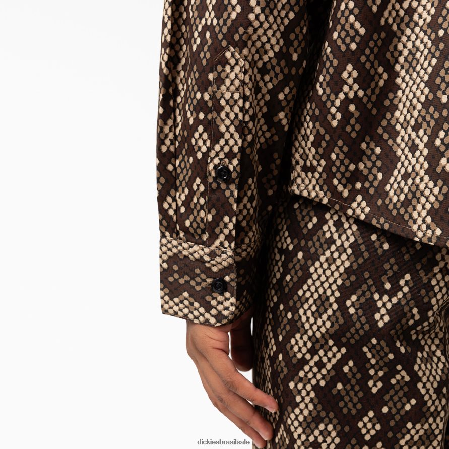 a camisa camden é uma execução ousada de um estilo clássico dickies. tratamos nossa autêntica camisa de botões de manga comprida com ajuste relaxado com nossa ousada estampa de pele de cobra digital sazonal. uma camisa clássica inspirada no trabalho feita para ser ousada.