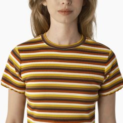 esta camiseta feminina listrada casual oferece uma silhueta de ajuste fino e comprimento curto que é fácil de estilizar com macacões dickies e estilos de cintura alta. a t-shirt ajustada é finalizada com uma bainha merrowed e detalhe de manga.