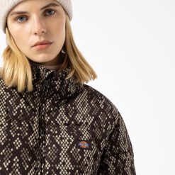 o puffer camden é uma elegante jaqueta feminina com zíper, gola alta e dois bolsos laterais. feito de tecido leve e acolchoado resistente à água. disponível em padrão de pele de cobra digital com etiqueta dickies tecida na frente. uma jaqueta quente e confortável feita para todo o outono e inverno.