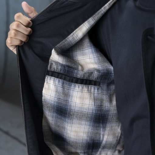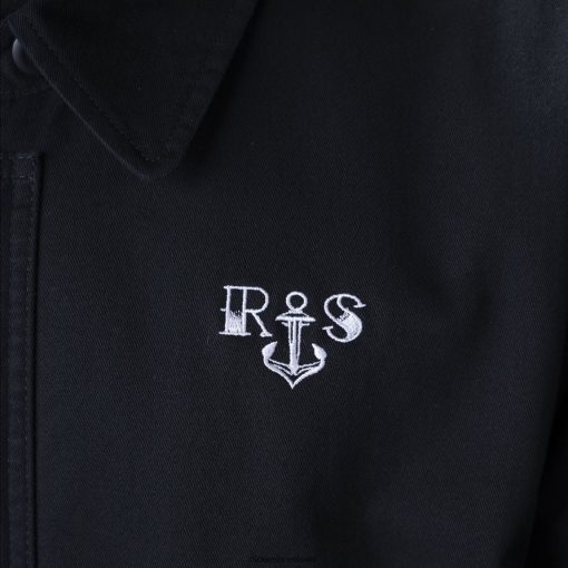 tornada reconhecível com bordado de âncora de assinatura rs e forro de flanela escovado ombre. para passeios longos e patins rápidos, a jaqueta de sarja escovada com forro de flanela foi personalizada para o skatista profissional ronnie sandoval. como um entusiasta da motocicleta, um fecho superior de botão e aba de tempestade foram adicionados para cobrir o zíper de comprimento total com ajustadores de botão nas mangas e cintura coincidindo com elástico embutido na parte de trás para manter tudo junto. um verdadeiro trabalho personalizado selado com uma etiqueta tecida de skate dickies.