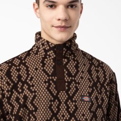 o camden fleece é um pulôver masculino de ajuste relaxado com um botão na gola alta. ele vem em nossa estampa digital sazonal de pele de cobra com detalhes em cáqui contrastante nos braços, na carcela, no peito e nos bolsos frontais embutidos. feito de lã polar macia que é quente e durável. uma peça descontraída feita para manter você aquecido no clima mais frio.